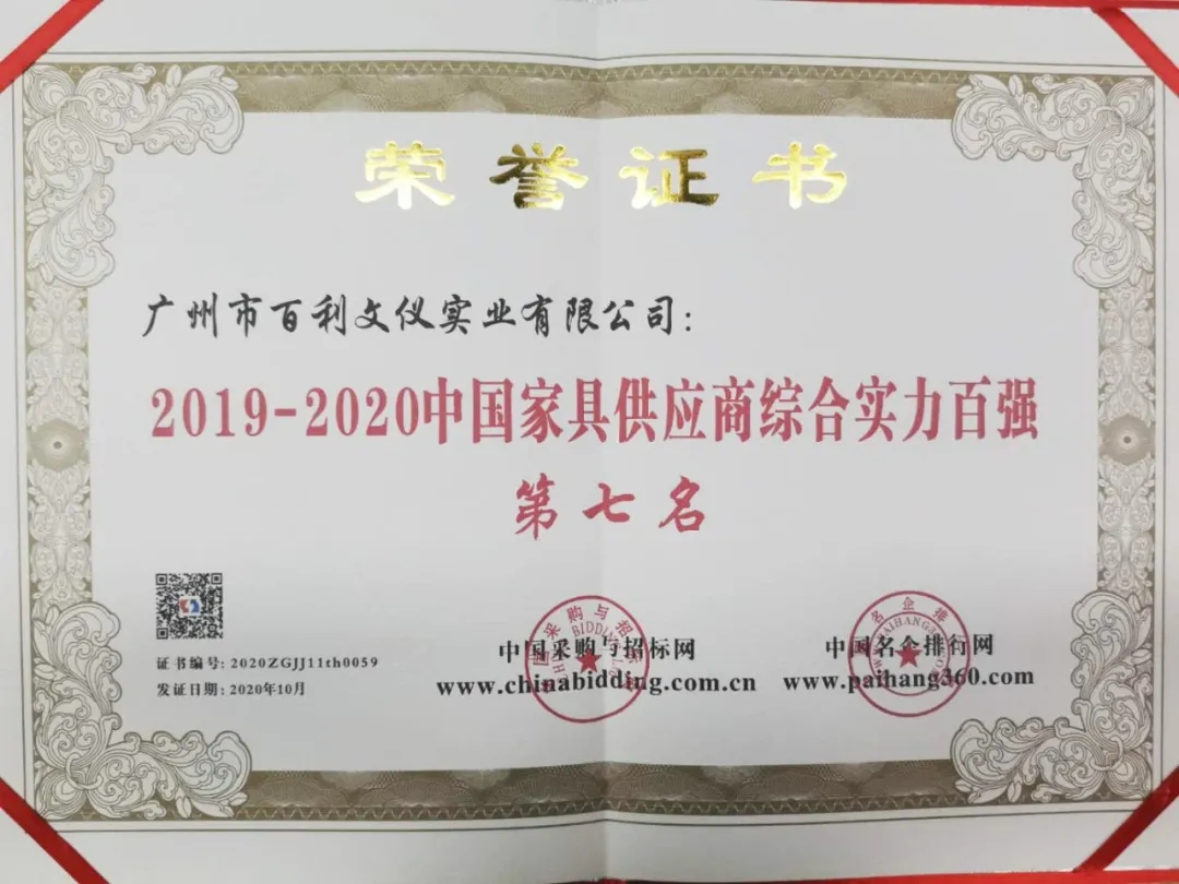 憑借扎實的業績基礎、良好的客戶口碑以及廣泛認可的行業影響力,在頒獎晚會中,百利集團獲得“2019-2020中國辦公家具十大領軍品牌”“2019-2020中國綠色辦公家具十大品牌”、“2019-2020中國家具供應商綜合實力百強”第七名等多項殊榮。