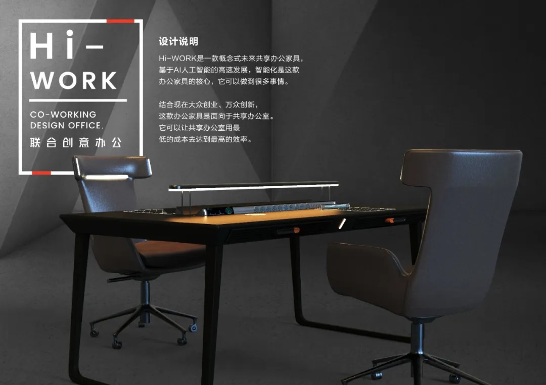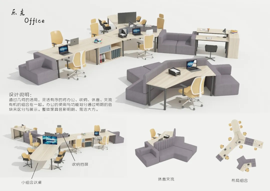 作品的策劃與大賽主題的整體關系,有清晰的創作概念示意圖,滿足共享辦公需求的辦公家具設計作品。